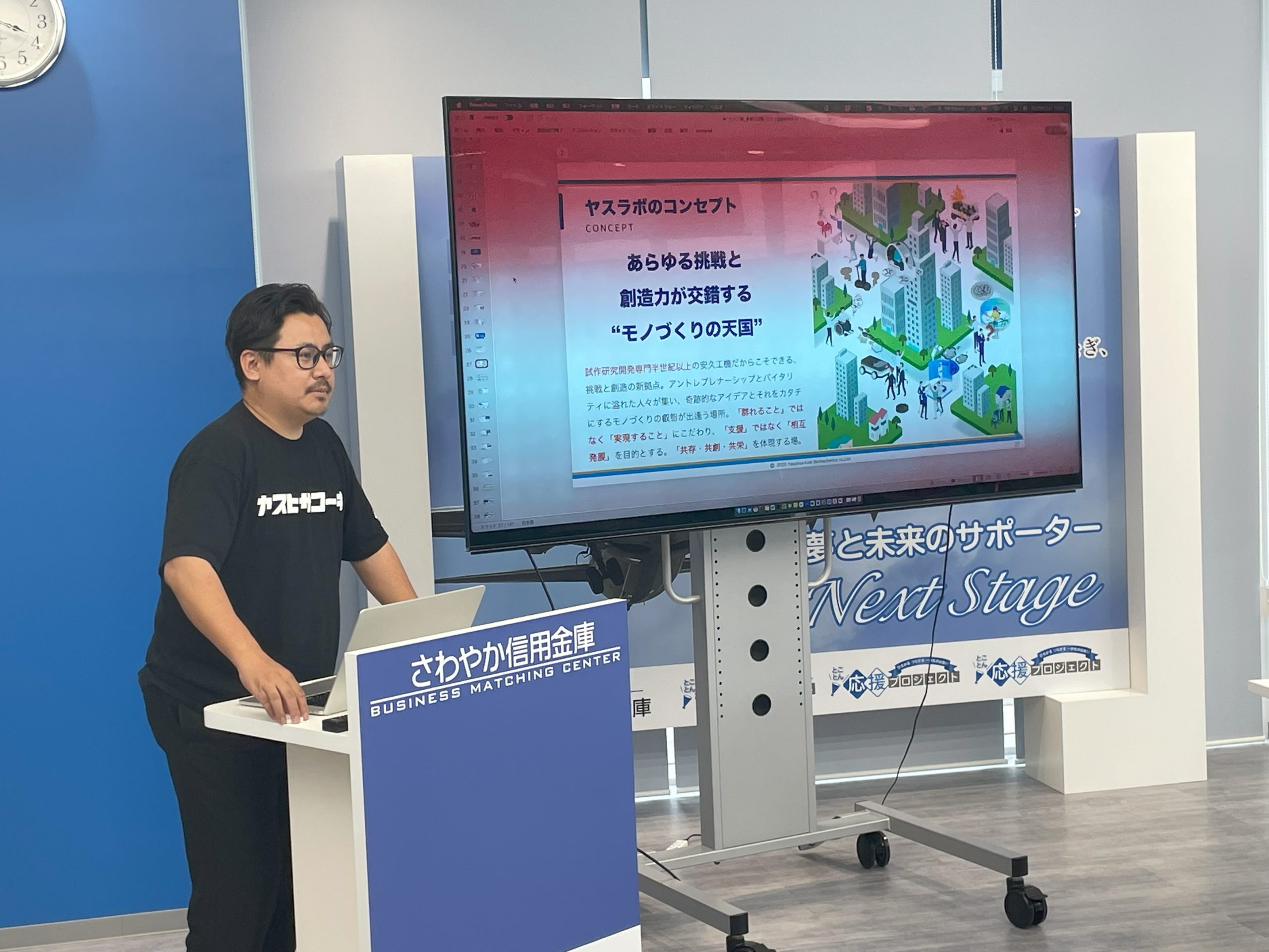 次に安久工機の田中宙さんによる新たな開発拠点「ヤスラボ」の紹介と、5月24日に行われたヤスラボ解説記念パーティーの様子の共有でした。